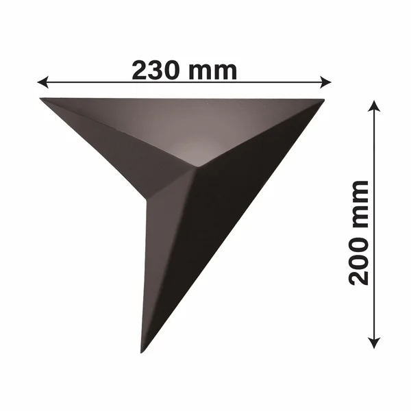 از نظر ابعاد، این چراغ  ۲۳ سانتی ‌متر عرض و ۲۰ سانتی‌ متر ارتفاع دارد. این ابعاد نسبتی بسیار ایده‌آل برای ایجاد جلوه بصری قوی بدون اشغال فضای بیش از حد روی دیوار است. اندازه چراغ به‌گونه‌ای است که هم در فضاهای بزرگ نمایان و تاثیرگذار است و هم در فضاهای کوچک جلوه‌ای ظریف و شیک ایجاد می‌کند. فرم زاویه‌ دار چراغ باعث می ‌شود حتی در حالت خاموش نیز مانند یک عنصر دکوراتیو مستقل روی دیوار بدرخشد و به ‌عنوان بخشی از طراحی داخلی یا نمای ساختمان عمل کند.